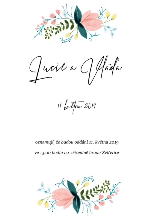 Přátelé, kamarádi, sdělujeme vám tímto onu šťastnou novinu (která přinejmenším pro účastníky běžkařských přejezdů zas takovou novinou není), že příští sobotu (poznáte ji podle toho, že v rozporu s umanutými předpověďmi meteorologů přijde šokující oteplení) dojde v přímém přenosu před našimi zraky ke splynutí rtů dvou našich kamarádů, a to v třaskavém polibku na důkaz vzájemného odhodlání projít zbytek života společně ruku v ruce jako manželé. Lucka si bere Vláďu, Vláďa Lucku. Obřad se koná 11.5.2019 na zřícenině hradu Zvířetice od 13:00 hod. a jste na něj srdečně zváni.
