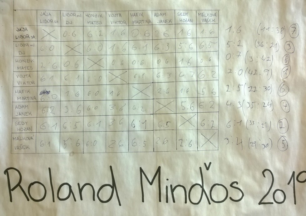 1/ Vojta+Viktor - 7:0, 2/ Hozan+Dan - 6:1, 3/ DJ+Liborek - 5:2, 4/ Adam+Janek - 4:3, 5/ Léňa+Vašek - 3:4, 6/ Martina+Hafik - 2:5, 7/ Jája+Libor - 1:6, 8/ Honzik+Mates - 0:7
