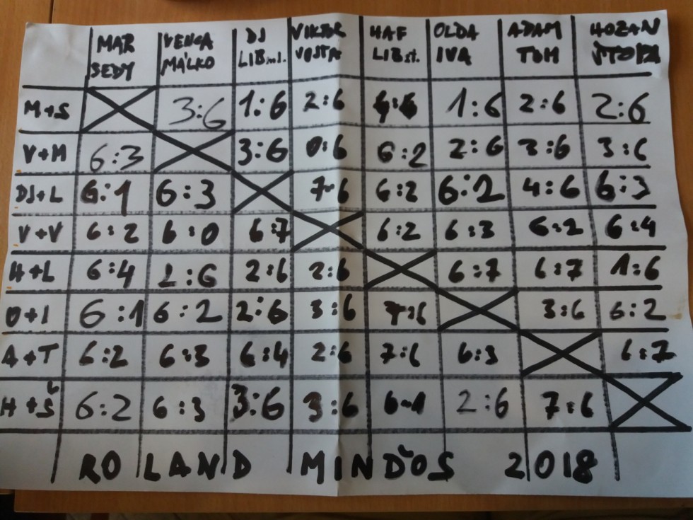 Přátelé, kamarádi, tenisový turnaj Rolanda Minďose - Minďův memoriál zná své vítěze pro rok 2018. Přes těžký los, kdy se museli stejně jako všichni jejich soupeři vypořádat postupně se všemi svými soupeři, přes nepřízeň jury, která několikrát hrozila operativní změnou pravidel pro určování pořadí a málem i prováděním dopingových zkoušek, přes prudké změny počasí, sluníčko v očích i vítr v zádech, si pro potem a slzami zaplacené vítězství nakonec dokráčela dvojice Jan Kysela (známější pod pseudonymem DJ) a Libor Bartoš MLADŠÍ (takzvaný Liborek). Sláva vítězům a čest poraženým. Obzvláště proto, že i letos byl turnaj (v případě některých dvojic) tak vyrovnaný, že ani vítězové nevyhráli vše a mezi prvním a druhým rozhodoval vzájemný zápas. Smutnější dvojicí na pásce byli tentokrát Vojta s Viktorem, kteří brali stříbro. Bronz pro sebe (je to možné??) urvala dvojice Adam + Tomáš Černík, kteří jako jediní sebrali zápas pozdějším vítězům turnaje. Hráli skvělý tenis a byli hodně blízko příčkám nejvyšším. Skvělé čtvrté místo jde za Ivčou a Oldou, dvojicí předvádějící nejpestřejší tenis s prvně jmenovanou coby neprostupnou zdí na síti a Oldou disponujícím nekonečnou paletou úderů. Na pátém místě se umístil Hozan, který měl nastupovat se Šťopkou, který se ale ráno sotva objevil, pak odjel s tím, že se vrátí, a od té doby už ho nikdo nikdy nespatřil, no a jestli neumřel, určitě někde žije dodnes, jen nevíme kde. K Hozanovi tak nejčastěji zaskakoval Hafik (dříve Michal Palounek), k vítězství proti Adamovu týmu s ním jako slepej k houslím přišel Sedy a obdobně v jednom zápase k celkově krásnému výkonu Hozanova týmu přispěl také Vojta. Šestou příčkou se nám do análů navždy zapsala druhá nejlepší smíšená dvojice ve složení Vašek Sekáč Beran a Léňa Málková Volfová Beranová. Lenčin precizní profesorský tenis fantasticky doplňoval Vašek svým smrtícím slajzem, kterým obzvláště po bouřce na rozměklé antuce dovedl k slzám nejednoho tvrďáka. Sedmé místo by se mohlo zdáti být zklamáním pro dvojici Hafik a Libor Bartoš starší, ovšem kdo byl, viděl a rozumí, musel být při konečném zúčtování bezpochyby šokózně rozčarován, jelikož oku lahodící obraz hry této dvojice zcela jistě nerezonuje s finálním počtem dosažených vítězství (1). Holt i taková je daň za dva zápasy smolně prohrané v tie-breaku. Ovšem pouze dvojice na posledním místě na tomto místě nezaslouží naprosto žádné slitování. Průměrně 250 nevynucených chyb za zápas nemohlo stačit na nic jiného než na nic. Pár světlých záblesků nedokázalo přehlušit zoufalou neúspěšnost v koncovkách mnoha gemů, což z dvojice Martina + Sedy učinilo největší čudly dne. Druhý jmenovaný se také již nechal slyšet, že na nějakou dobu opouští svět špičkového tenisu a svých trapných velkohubých proklamací a vymění je za kurzy hluboké introspekce a sebereflexe tak, aby si za devět měsíců již zcela ve vší skromnosti došel pro titul Krále Bakajdy při jubilejním 20. ročníku lyžařských závodů.