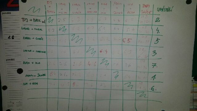 1. Adam + Janek, 2. DJ + malej Bacil, 3. Martina + Viktor, 4. Libor + Michal Palounek, 5. Karel + Luděk, 6. Iva + Olda, 7. Olča + Jakub