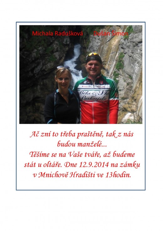Tak už došlo i na Dušana! Třebaže v srdci své cesty s Míšou Raduškovou spojili už dávno, nyní tak učiní před zákonem a našimi zraky. Jak stojí v přiloženém oznámení, obřad, na který jste všichni srdečně zváni, se uskuteční tento pátek 12.9. ve 13 hod na zámku v Mnichově Hradišti.
