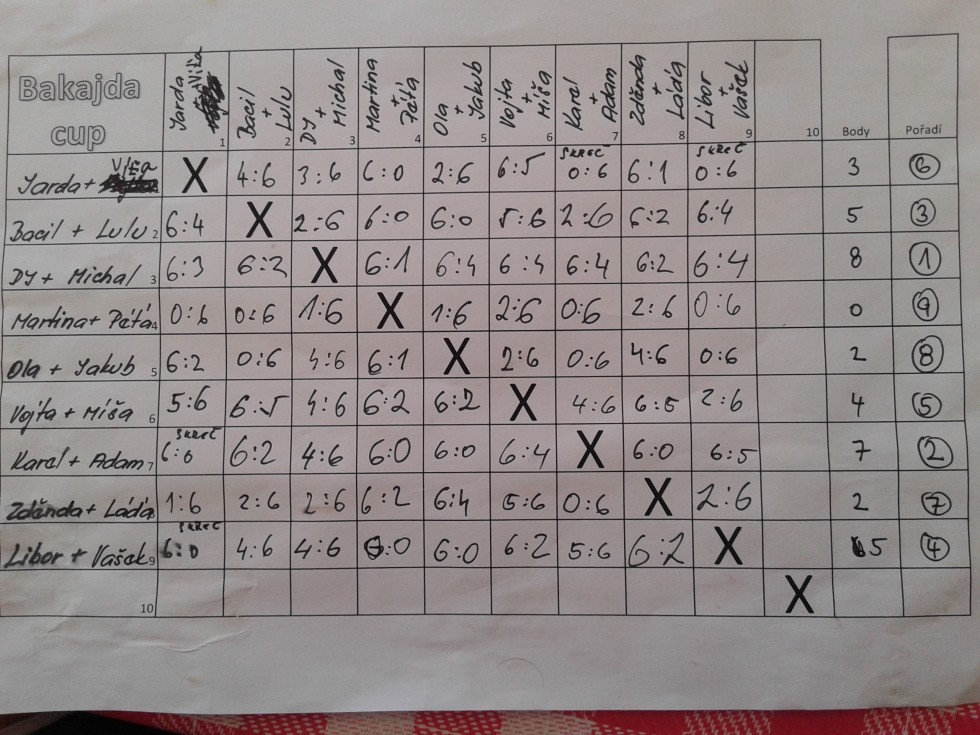 Prvním přihlášeným párem do smíšené čtyřhry na náš tenisový turnaj (ovšem pro rok 2029) je sourozenecký tým nominovaný trenérským duem Kájou a Adamem ve složení Bára Blažková a František Blažek. Přihlášku si podali právě dnes. Našim mladým bakajďáckým sportovcům gratulujeme k odvaze nechat se koučovat právě touto dvojkou, jejich koučům pak pro nastávající období přejeme mnoho úspěchů při aplikaci nejmodernějších tréninkových metod.