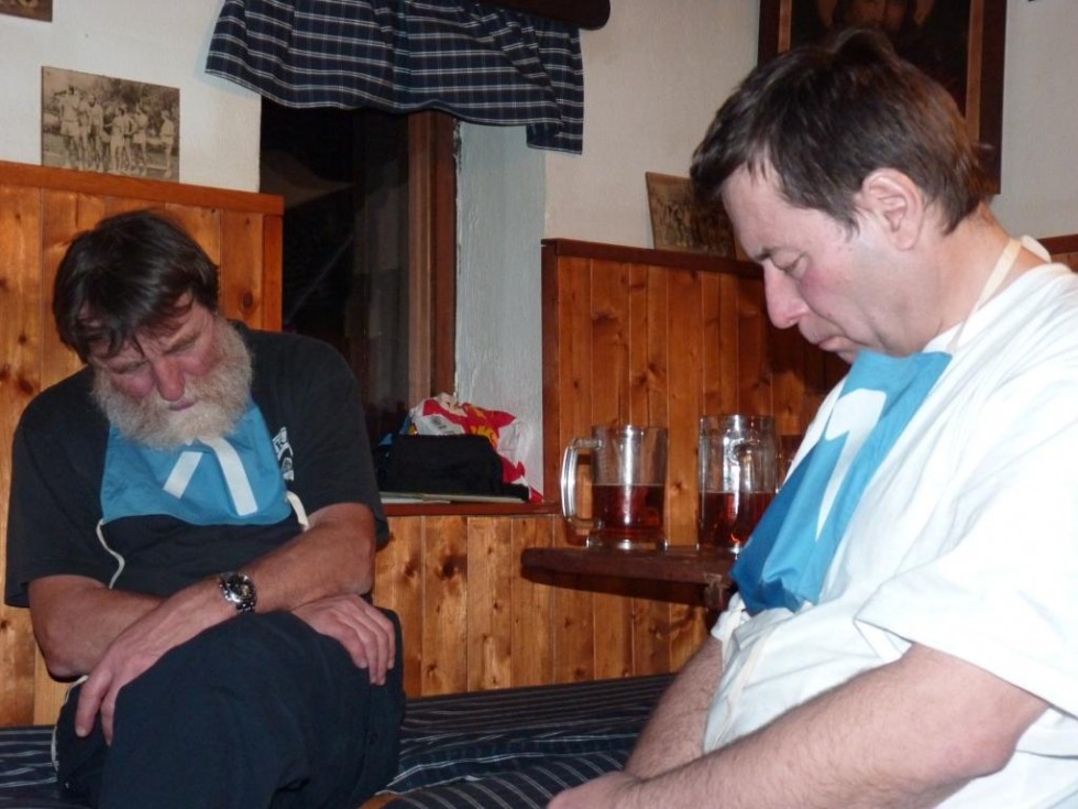 V každém případě na sraz většiny závodníků, ke kterému dojde tradičně v pátek večer na boudě. Kromě připomenutí trati a losování čísel bude též odhalen model startu závodu na běžkách, což může být pro některé borce alfou a omegou úspěchu. V kuloárech (to slovo jsem psal asi načtyřikrát) se šušká cosi o upravené gundersenově metodě, při níž v čase nula vyráží na trať závodník s nejvyšší naměřenou hodnotou alkoholu v krvi. Další závodníci vybíhají postupně s hendikepem cca 0,1 promile = 5 vteřin. Zcela střízliví závodníci jsou pak pro nesportovní chování hned na startu diskvalifikováni... Pro případ, že by se jednalo o novinářskou kachnu, se však prosím raději na start dostavte všichni. Závod ve slalomu se pojede už tradičně jeden za druhým. A doufejme, že to bude na stráni u Bakajdy, jejímuž usilovnému sešlapávání se minulý víkend věnovala hrstka nejmenovaných nadšenců. Rolba nepřijela, jelikož je tolik sněhu, že se nemohla podhrabat pod lanem.