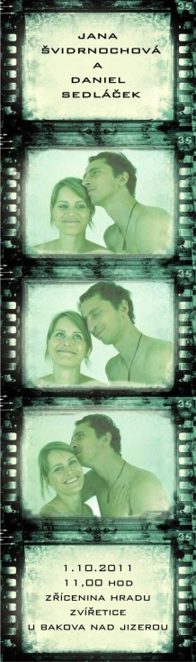 jak většina z vás již ví, došlo na nejhorší, žením se a Janka se vdává. Řízením osudu oba ve stejný den a na stejném místě. Bude nám radostí a potěšením, pokud náš slavnostní slib poctíte svým svědectvím, člověk se přece jenom žení dvakrát třikrát za život. Vstup na manželskou cestu životem posvětí náš skvělý kamarád Petr Šulc přímo na pozůstatcích hradu Zvířetice u Bakova nad Jizerou 1. října 2011 v 11:00 hod.