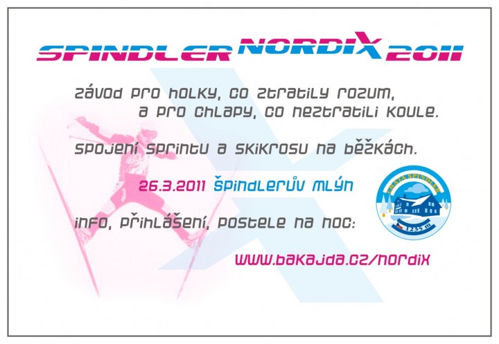 Ve spolupráci se Zdendou Křížem a Chatou Spindler jsme pro vás připravili netradiční zakončení lyžařské sezóny. Je jím již dříve avizovaný závod na běžkách z kopce i do kopce. Chystáme pro vás příjemný víkend těsně pod hřebeny Krkonoš, vyplněný závodním programem a parádní hudební tečkou na závěr. Mrkněte na propozice a popis závodu na webu www.bakajda.cz/nordix a neprošvihněte akci, která se již (nutno přiznat) nemusí opakovat.