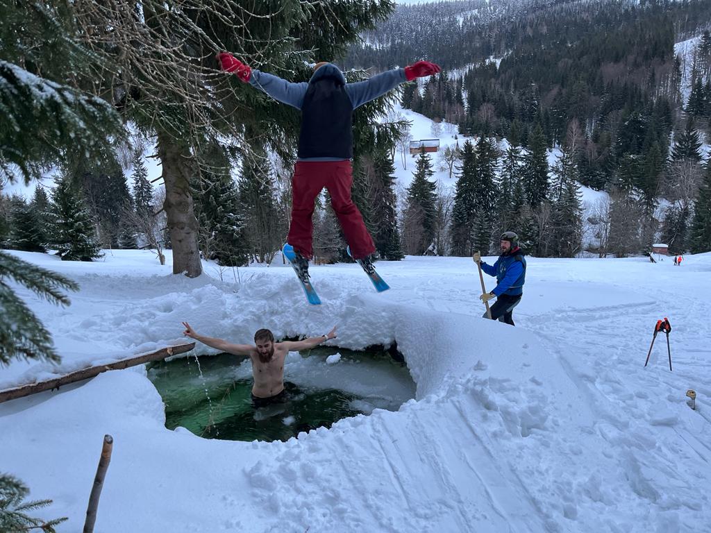 Co je však nejpodstatnější. Letošní zimu jsme v údolí Ryzího potoka trochu více zapracovali na prohloubení sousedských vztahů (a nemyslí se tím žádné mimomanželské etudy), což přineslo své ovoce ve chvíli, kdy jsme to potřebovali nejvíce. Drahoňovští a Kazdovi z jižního svahu se nezištně nabídli, že nám svými skútry pomohou urolbovat stráň pod Bakajdou. V jednu hodinu nastoupila ruská mašina proti kanadské mašině a i když jsme nejprve byli trochu skeptičtí, výsledek dalece předčil naše očekávání. Na připravenou pistu stačilo vyjet lyžemi a důkladně ji sesmýkat. Výsledkem byl nejlepší terén pro slalomovou část závodu za několik posledních let, kdy jsme si obě kola dokonce mohli dovolit absolvovat v jedné trati! Útok na královskou korunu přetavil v přesvědčivé slalomové vítězství Matěj. Druhé místo po drobných organizačních komplikacích bral Adam, a to mimo jiné i díky chybě nakonec třetího Dana před cílem druhého kola. Pro celkové výsledky v kombinaci byla rozhodující již dříve zmíněná Kubova karma. Na vypůjčených lyžích totiž netrefil správné nastavení vázání, což ho katapultovalo nejen z trati prvního kola, ale též z boje o královský titul.
