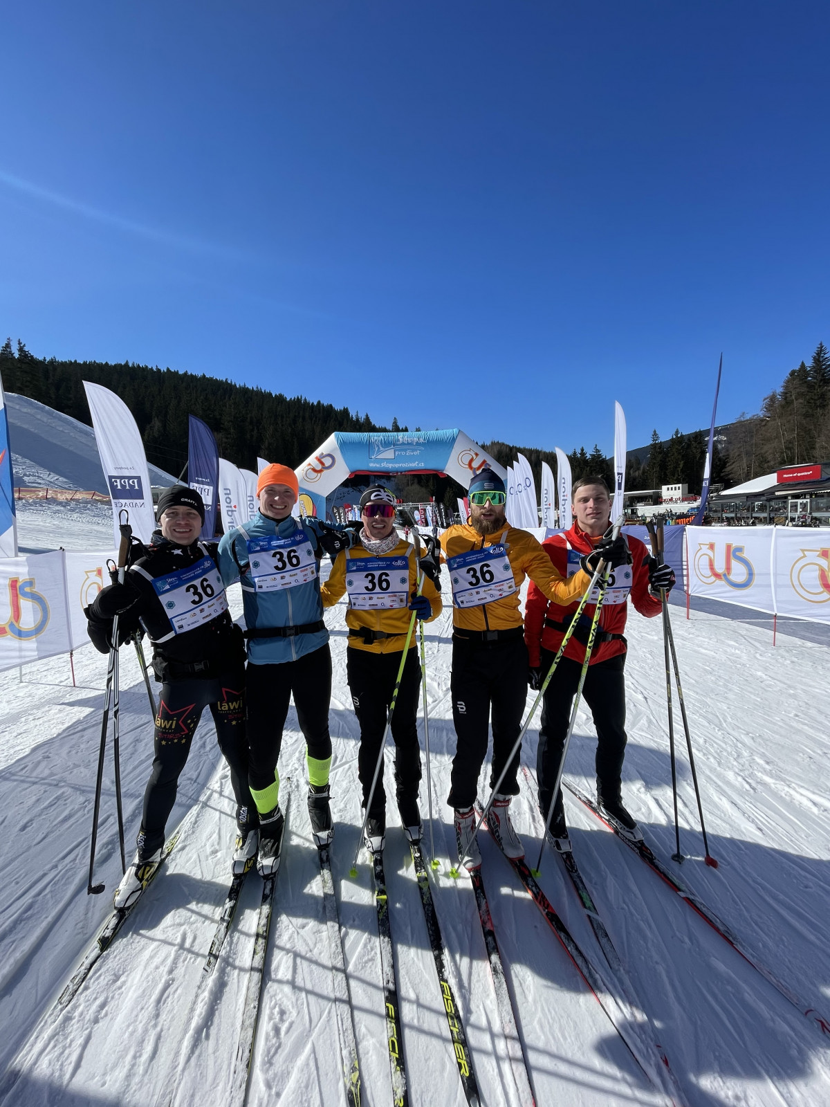 Bakajďácké áčko startovalo ve složení Jakub Šulc, Pepa Frencl, Ondra Preněk, Libor Bartoš a Michal Suchý. Průběh závodu nám zprostředkoval Kuba: Taktika byla zvolena ve stylu, že si to nesmíme nechat ujet v prvním kopci, což úplně nepotěšilo Pepu, kterej to hrnul skoro celý soupaž. Na Pláních jsme se shodli, že možná malinko zpomalíme, a až na Pepův kotrmelec při sjezdu na Friesovky to celkem jelo až na Pražskou. Občas super rychlý sníh, občas tupej, který moc neodjížděl. Na Pražský jsme nic nepodcenili a někteří zahájili přísun gelů, který stupňovali až do posledních kilometrů. Cesta nad Pardubky byla opět skvělá, sjezd jako vždy pekelně rychlej a samozřejmě dolů jsme získávali nejvíc. Teda až do chvíle, kdy to na konci sjezdu položil Libor. Chvíli se z toho vzpamatovával a hlavně přišel o košíček na hůlce, který už nenašel. V kopci na Pardubky se to chytlo Pepovi a za neustálého štěkání jedno ze soupeřů jsme to dali na jeden zátah až nahoru, kde Libor vyhlásil obědovou pauzu a v klidu tam poslal tortillu. Na Pražský už na nás čekali Vláďa a Zdenda, který Liborovi půjčil svoje hůlky. Cesta zpátky byla už trochu na morál. Pepa sežral všechny gely, na který přišel, a trošku se protrápil, ale dal to dobře až nad Klínovky. Potom už jen sjezd dolů, kde se přidal v závěru s pádem taky Préňa, ale to už jsme byli vlastně v cíli. Všichni jsme si to perfektně užili a příští rok jedem zas!