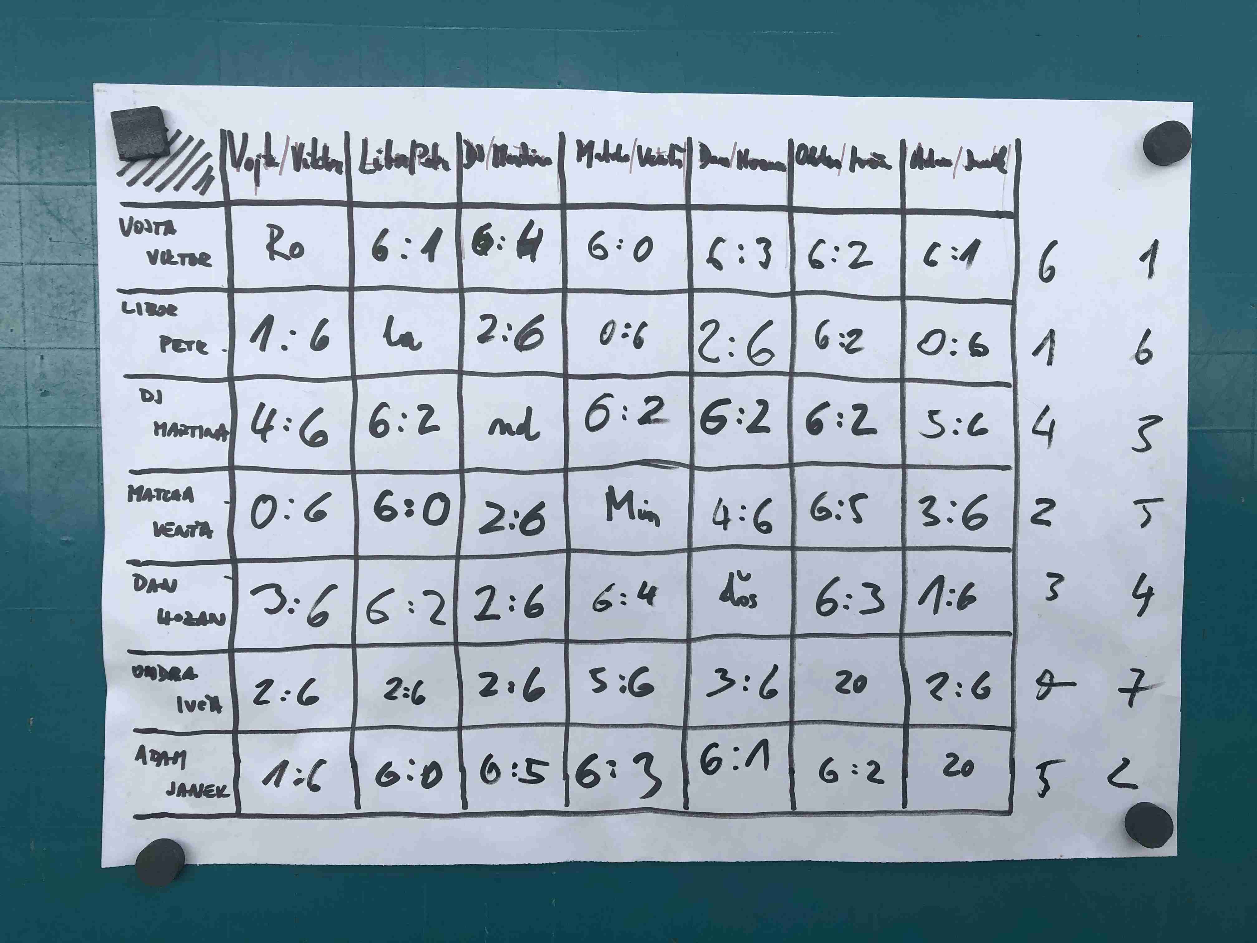 Výsledky turnaje Rolanda Miňďose 2020: 1. Vojta+Viktor, 2. Adam+Janek, 3. Martina+DJ, 4. Hozan+Sedy, 5. Matcha+Ventilek, 6. Libor+Petr/Bacil, 7. Iva+Ondra Kys.