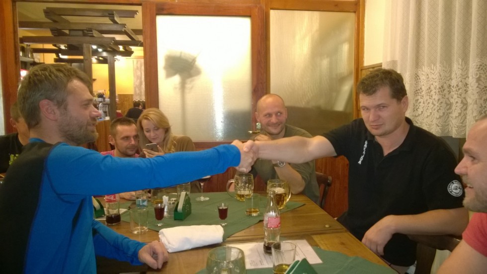 Dohodli jsme se s bráchou, že pohár stráví čas u každého z nás v závislosti na podílu na celkovém výsledku. U mě to byla doba od převzetí při vyhlašování do doby předání brašulemu (ano, bylo to těch slavných 15 vteřin). Já bych se ale zaměřil na "zašantročení" výsledků - "zašantročení" fotek - trochu to připomíná praktiky sicilských přátel, přeloženo do češtiny - Adamo, capo di tutti capi...Doufám, že nenajdu svoji raketu na dně Jizery s betonovou skruží kolem hlavy!