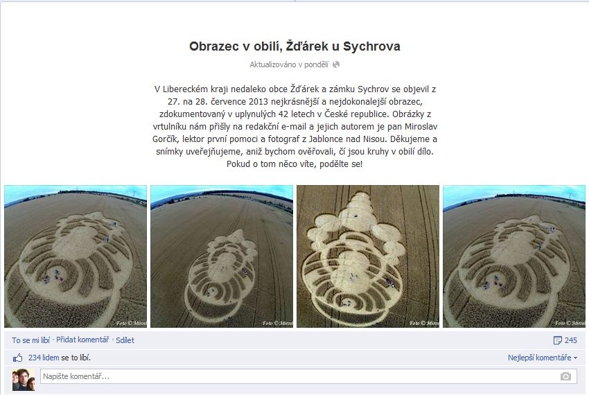 Možná o tom víte, možná nevíte, možná vás to nezajímá, ale na Paceřáku, těsně vedle dálnice u obce Žďárek se nedávno přes noc objevily krutopřísně tajemné obrazce v obilí. To kdybyste jeli kolem (sjezd na Paceřice), pořád tam jsou k vidění. Přikládám foto.